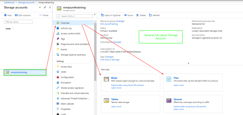 Under the general info we have service section. Blobs, Files, Tables and Queues. We will focus on Blobs and Files.