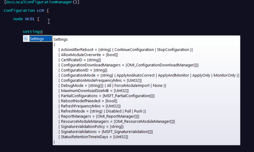 Once we know that let’s configure our LCM. We start with this keyword right at the very top, DSCLocalConfigurationManager. Through the configuration keyword you’re defining a name of something that gets generated. Now if you remember from the previous post when we did a configuration that install IIS, what you do when you see all the details, you’ll see that the configuration that gets generated is some node name .MOF. It was DC01.mof. Now that configures the machine. What we want to do is we want to configure the LCM agent on that machine. One way to think about this is what we call meta configuration. You configure the configuration management agent. You’ll see when we run this, that tag at the top saying (DSCLocalConfigurationManager) when you run this name, instead of generating a MOF, generate a metadata.MOF. Then that’s pushed through a different mechanism. MOFs are generated and pushed through Start-DSCConfiguration. Metadata.mofs are pushed through Set-DSCLocalConfigurationManager. We can use IntelliSense features to show us how to make the configuration.