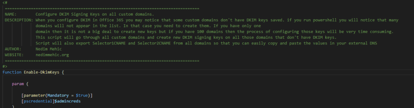 If you run powershell command (Get-DkimSigningConfig) you will notice that many domains will not appear in the list. If you only have one domain then it is not a big deal to create new keys but if you have 100 domains then the process of configuring those keys will be very time consuming. This script will go through all custom domains and create new DKIM signing keys on all those domains that don’t have DKIM keys. Script will also export Selector1CNAME and Selector2CNAME from all domains so that you can easily copy and paste the values in your external DNS. You can run script even if all domains have DKIM keys present.