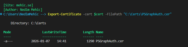 Export-Certificate -cert $cert -FilePath "C:\Certs\PSGraphAuth.cer"