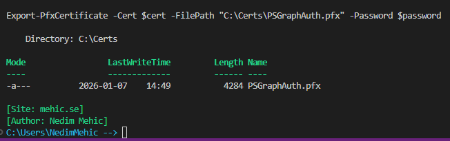 Export-PfxCertificate -Cert $cert -FilePath "C:\Certs\PSGraphAuth.pfx" -Password $password