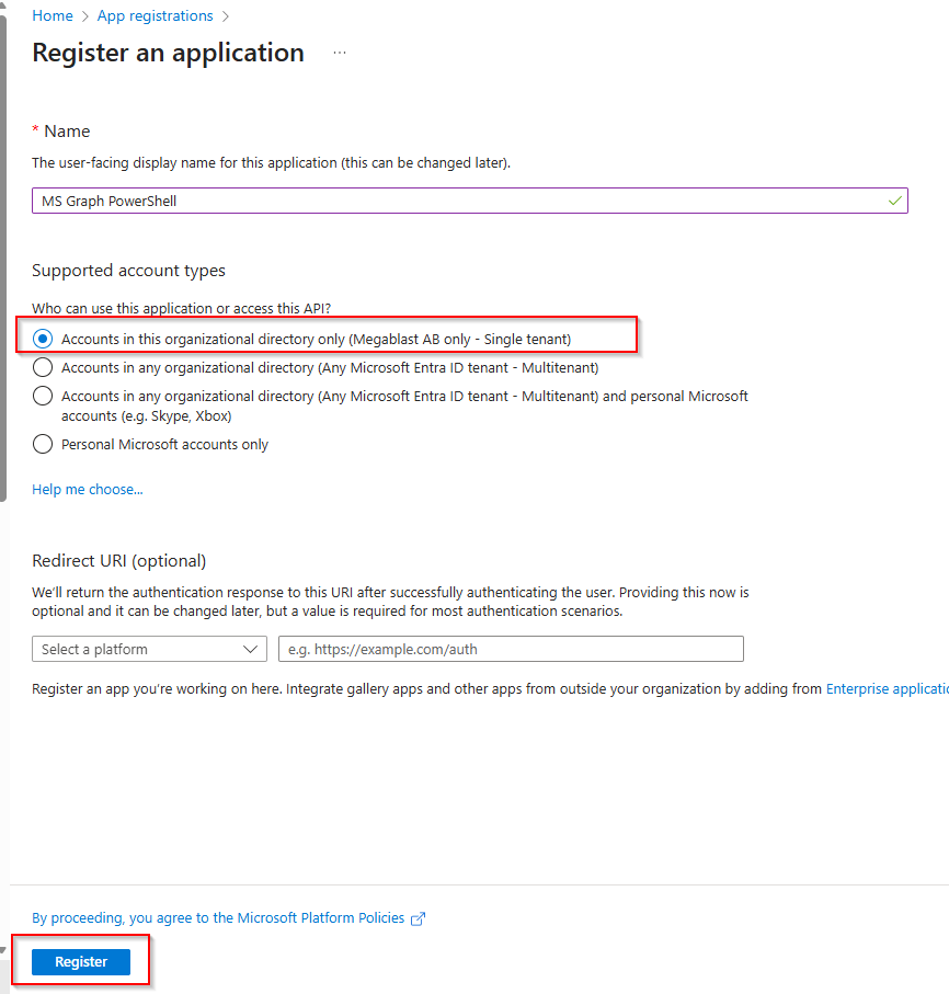 For this example, I’ll name the application MS Graph PowerShell. I’ll leave the setting as Accounts in this organization only to ensure that only users within my organization have access. Regarding redirect URI options, we don’t need to configure anything for this scenario, so we can simply click Register to complete the app registration.