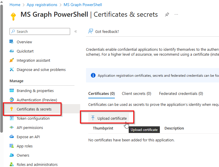 Next, navigate to Certificates & secrets. You’ll see three tabs: Certificates, Client secrets, and Federated credentials. Go to the Certificates tab and click Upload certificate