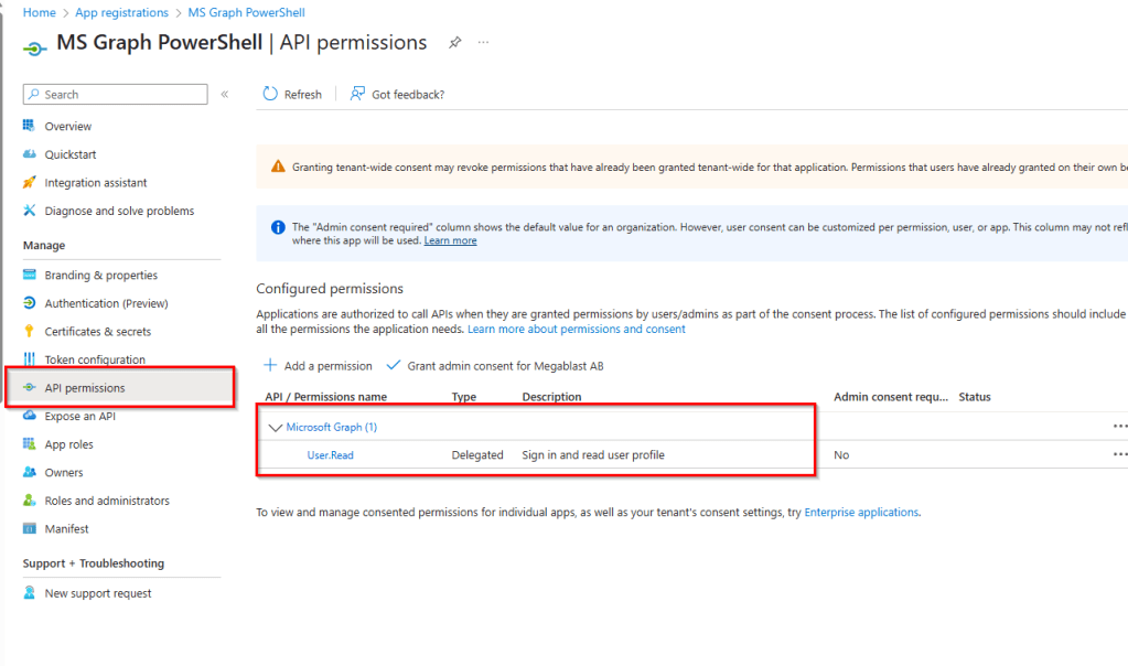 I will just add User.ReadWrite.All and click on Add Permissions. After adding them, you’ll notice a status indicating Not granted for Megablast.