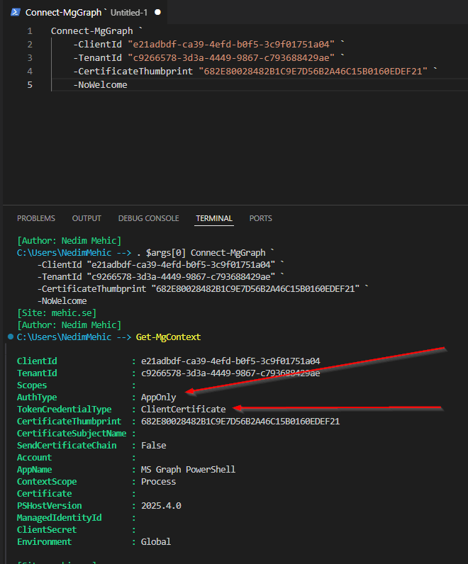 Now, let’s connect to MgGraph using this information. I will include -NoWelcome parameter as well to exclude the welcome message. This time, when we connect we will see AuthType –> AppOnly (instead of Delegated) and under the TokenCredentialType –> ClientCertificate (instead of InteractiveBrowser) .