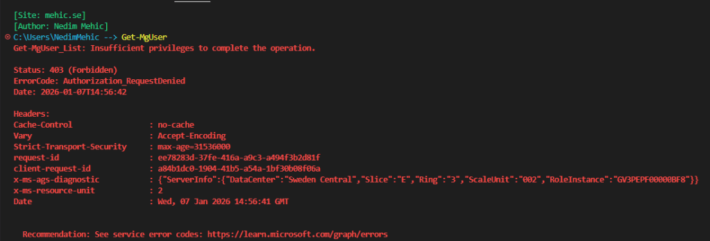 If I run the Get-MgUser command now, I can successfully retrieve the list of all users. However, if I attempt to retrieve all groups, I will receive an error. This behavior is expected and confirms that the permissions are working exactly as configured.