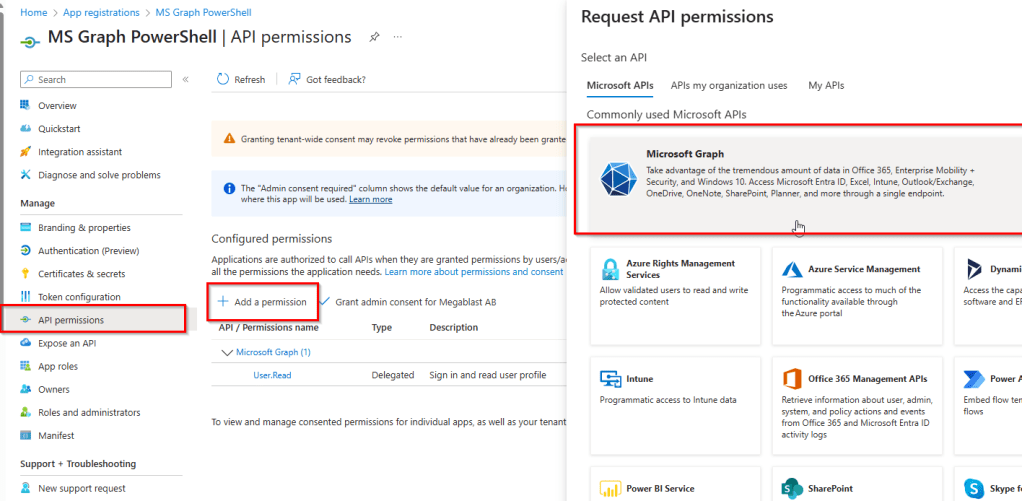 To add the required permissions, switch back to the browser, click on API Permissions and select Add a permission –> Microsoft Graph