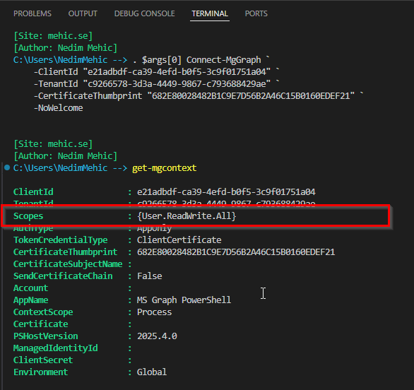 As expected, the context now shows User.ReadWrite. When connecting using an app registration, we don’t pass scopes directly in the connection. Instead, the app relies on the permissions that are predefined and associated with the app registration itself.