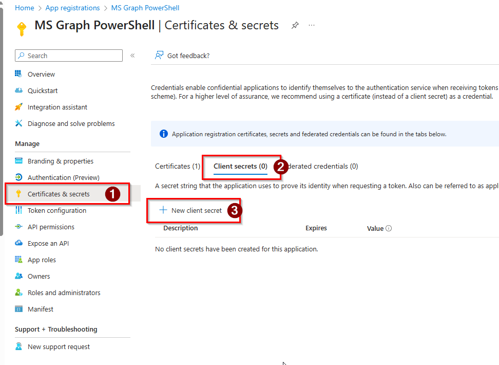 First step is to create a new client secret. Click on Certificates & Secrets, client secrets tab and click on New Client Secret