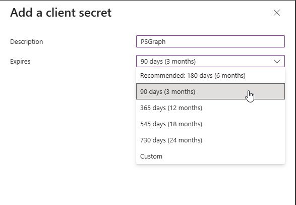 Provide a description for the client secret and select an expiration period that aligns with your security and operational requirements. Once done, click on Add