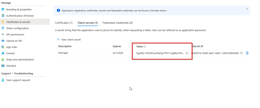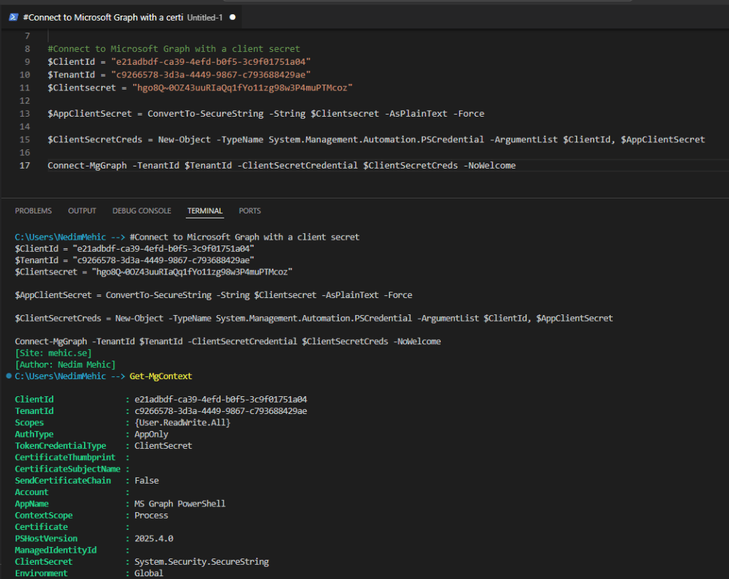 An app secret functions like a password for the application. It proves the app’s identity to Azure and allows it to access resources according to the permissions assigned. However, app secrets have inherent security risks. Since they are essentially passwords, they must be stored securely and rotated regularly, any accidental exposure could allow unauthorized access to your tenant. For this reason, certificates are generally recommended for long-lived automation scenarios.