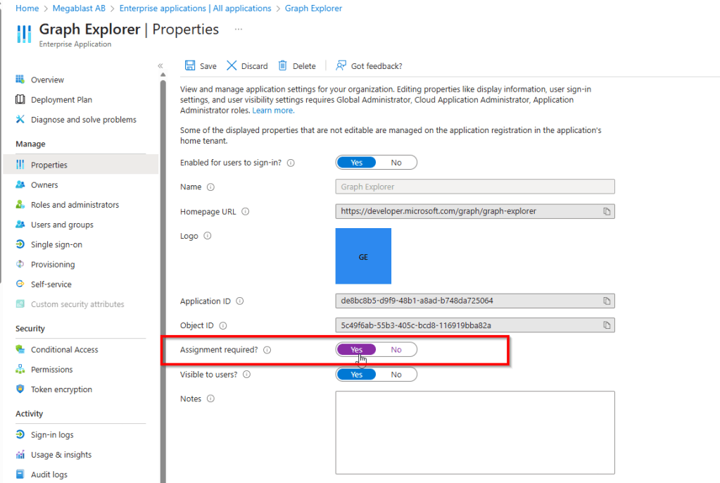 - App Assignment – It’s best practice to configure any application used to connect to Microsoft Graph to require assignment in Microsoft Entra. This ensures that only users who have been explicitly assigned to the application can access it and utilize the permissions granted.