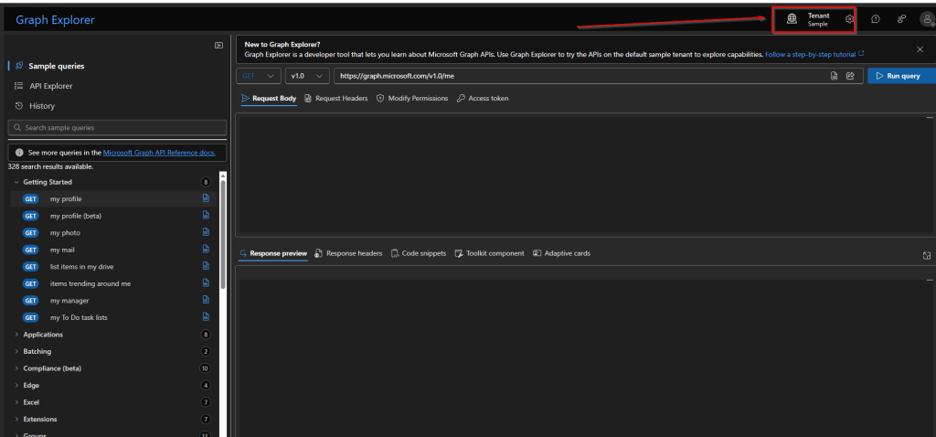 When you browse the link, you will see Tenant Sample, which means you are using Microsoft Graph Explorer anonymously and are not connected to any real tenant or organizational data.