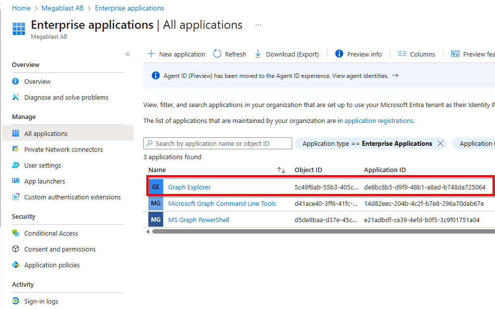 After signing in, Graph Explorer uses a Microsoft-provided application registration (Graph Explorer) in your tenant. This means you don’t need to create your own app registration just to start testing Graph requests. Instead, you can request delegated permissions directly from the interface.