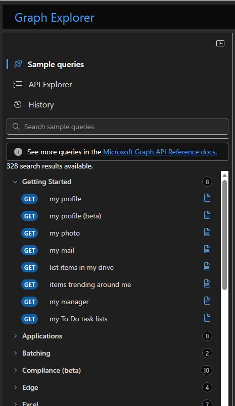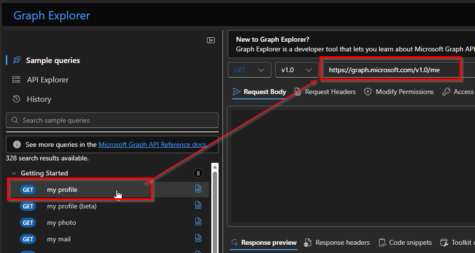 Sample queries provide prebuilt, ready-to-run examples of common Microsoft Graph requests. They are organized by workload (such as Users, Groups, Mail, or Teams) and help you quickly see how typical Graph queries are structured. Sample queries are ideal when you are new to Microsoft Graph or want to understand what an endpoint returns without having to build a request from scratch. When you select My profile, Graph Explorer automatically fills in the URL saving you from typing it yourself.