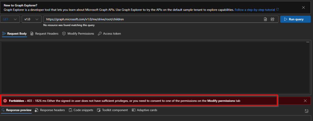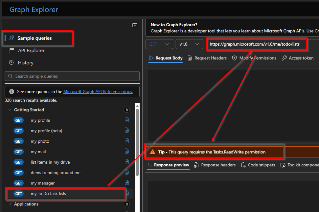 If you choose a sample query and don’t yet have the required permissions, Graph Explorer will notify you with useful info about the permissions needed to run that query or if the query requires mandatory parameter, how to get it and so on.