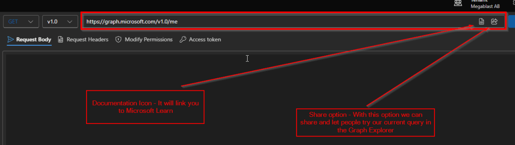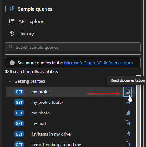 Next to each sample query resource, such as My profile or other available resources, you’ll notice a documentation icon. This icon links directly to the relevant Microsoft Learn (MS Docs) page for that specific Microsoft Graph endpoint. By selecting it, you can access detailed documentation, including endpoint descriptions, required permissions, request examples, and response details, which helps you better understand how the resource works and how to use it correctly.