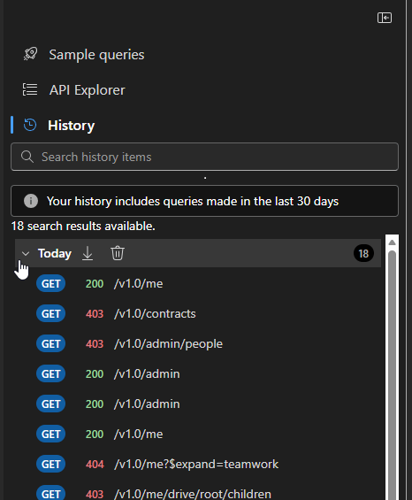 All queries you run in Graph Explorer are saved for 30 days in the History tab. Here we can export all items, delete, run a query etc.