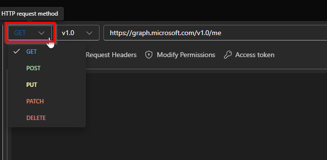 - HTTP methods: The HTTP methods dropdown in Graph Explorer lets you choose the type of request you want to send to Microsoft Graph. Each method determines how the API interacts with the resource you’re targeting.