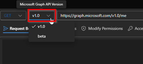 - API Version: The API version drop-down lets you choose which Microsoft Graph API version to query, either v1.0 or Beta. Selecting Beta version will give you much more information. Part two of this series will show us how these two differ and when to use each.