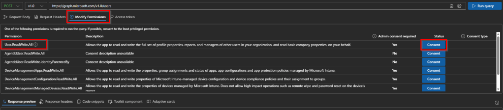 - Modify permissions: When you use graph explorer (or any app calling Microsoft Graph), Graph doesn’t just let anyone do anything. It checks who you are and what you are allowed to do. Because some operations are sensitive like reading emails or accesing files, before graph lets your query run, you must give permission. So this section lets you see all the permissions Graph Explorer can request and shows whether each one needs admin approval. You can review the list, check which permissions are already granted, and click the blue “Consent” button to approve any you need. Once consented, you can run queries that require those permissions without getting blocked.