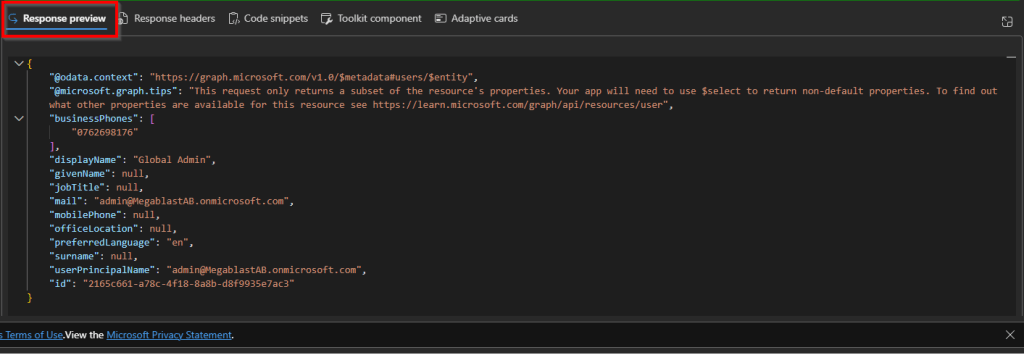 - Response Preview: this section shows the results returned by Microsoft Graph after you run a query. It lets you quickly see whether your request worked and review the data or errors that came back from the API.