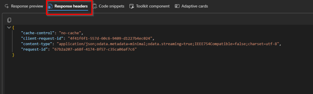 - Response Headers: this section shows extra details about the request, such as status codes, request IDs, throttling info, and other metadata returned by Microsoft Graph. This helps you understand how the request was processed and troubleshoot issues beyond just the response body.