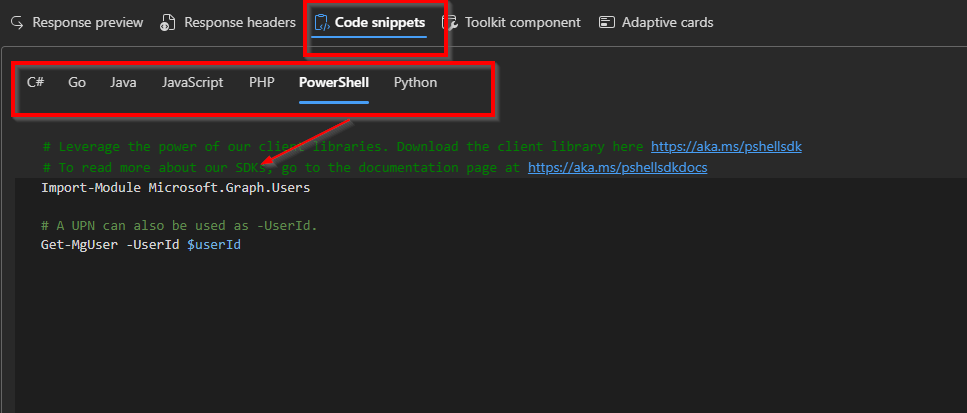 - Code snippets: This is really useful section because it shows us ready-to-use examples of the same request in different programming languages. It helps you quickly copy the request into your own app and see how to call the Graph API without having to write the code from scratch.