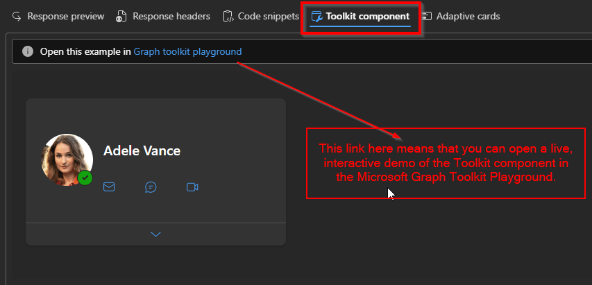 Toolkit Components: They are prebuilt UI pieces (like a user profile card, people picker, or task list) that already know how to talk to Microsoft Graph. Instead of writing API calls, handling sign-in, and building the UI yourself, the component does it for you. You add a Toolkit component to your app (usually as an HTML tag), sign in once, and the component automatically fetches and displays data from Microsoft Graph. For ex Person component can automatically show a user’s name and photo without you writing any API code.