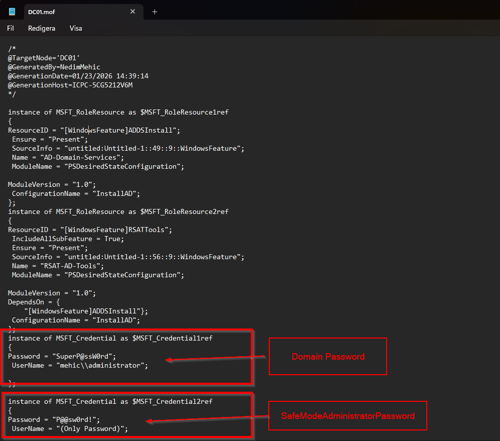 Because we allowed plain-text passwords, those credentials are written directly into the MOF file in clear text. Anyone who has access to this file can simply open it and read the passwords without any additional effort. This clearly demonstrates why this approach is insecure and unsuitable for anything beyond learning or demo purposes.