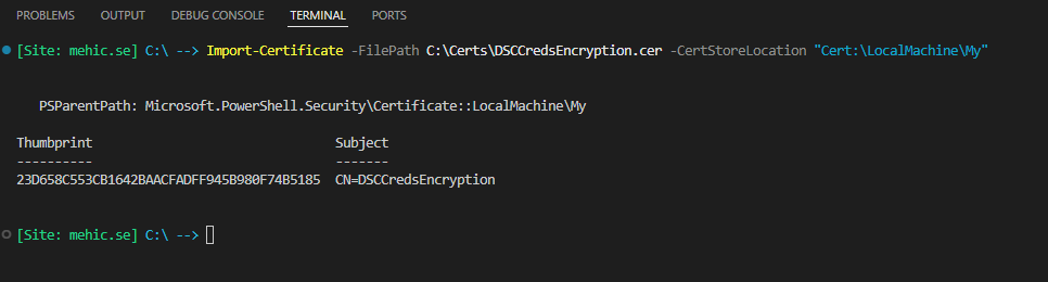 Import-Certificate -FilePath C:\Certs\DSCCredsEncryption.cer -CertStoreLocation "Cert:\LocalMachine\My"