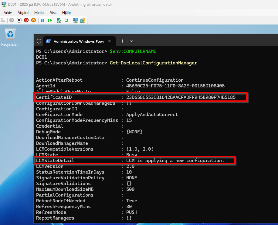 Now that everything is in place, we can proceed with the configuration. I’ll be using the same configuration document from the previous post, however, this time we’ll update the configuration data and change LCM to use certificate on the target node.