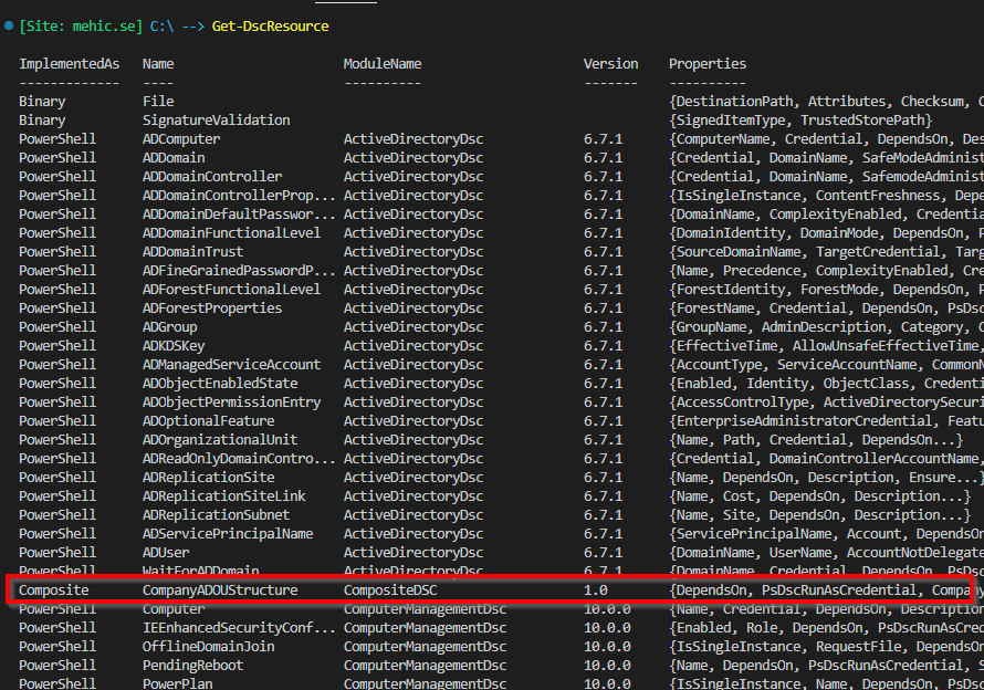 Now let’s see how this works in practice. In this example, I’ll reuse the same configuration document from the previous post, where we installed the domain controller, and extend it by incorporating our newly created composite resource. As you may recall from the beginning of the post, building the Organizational Unit structure required multiple individual DSC resources. By using a composite resource, that complexity is reduced to just two parameters in the configuration document, resulting in a significantly cleaner and more readable configuration.